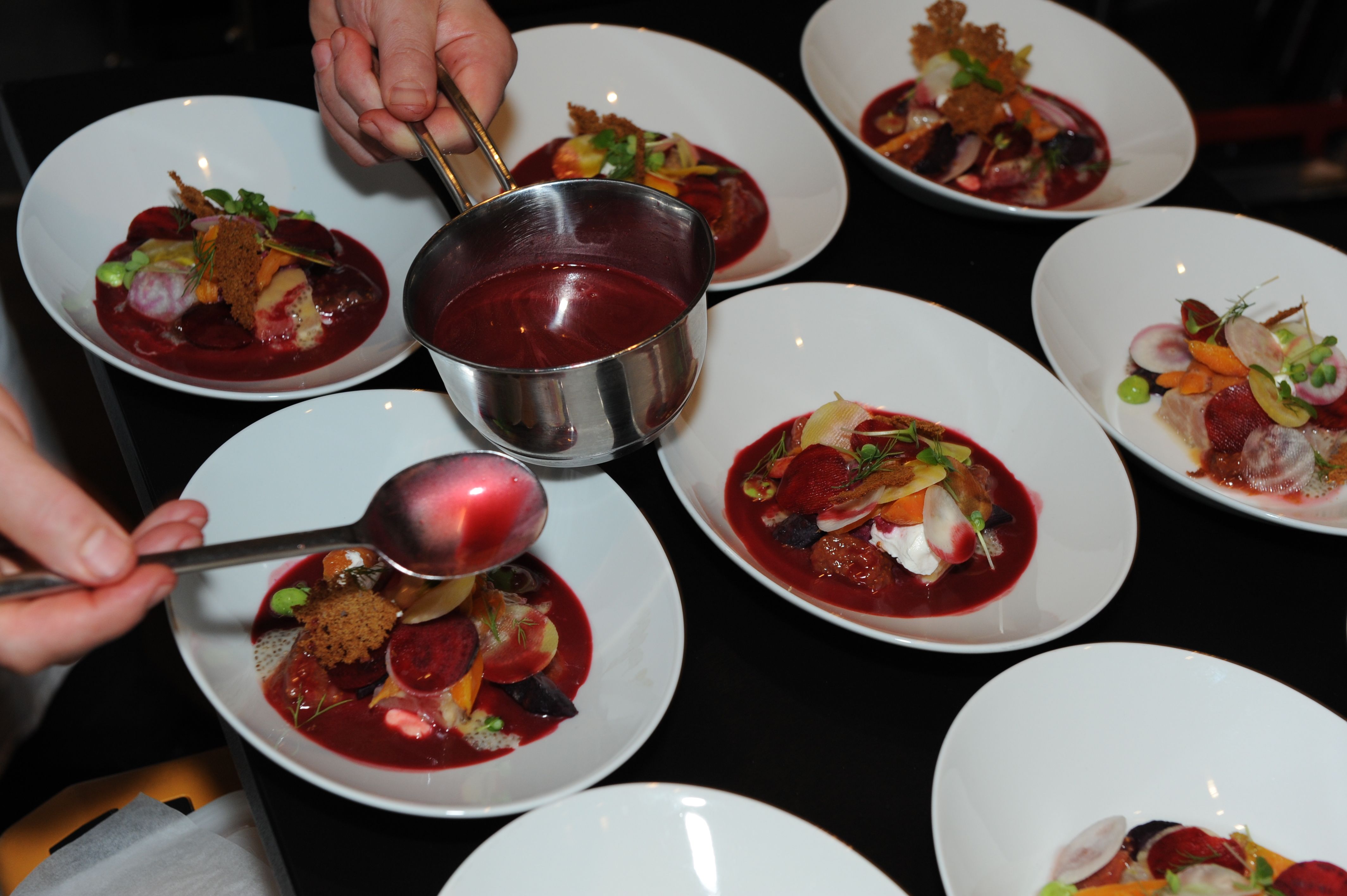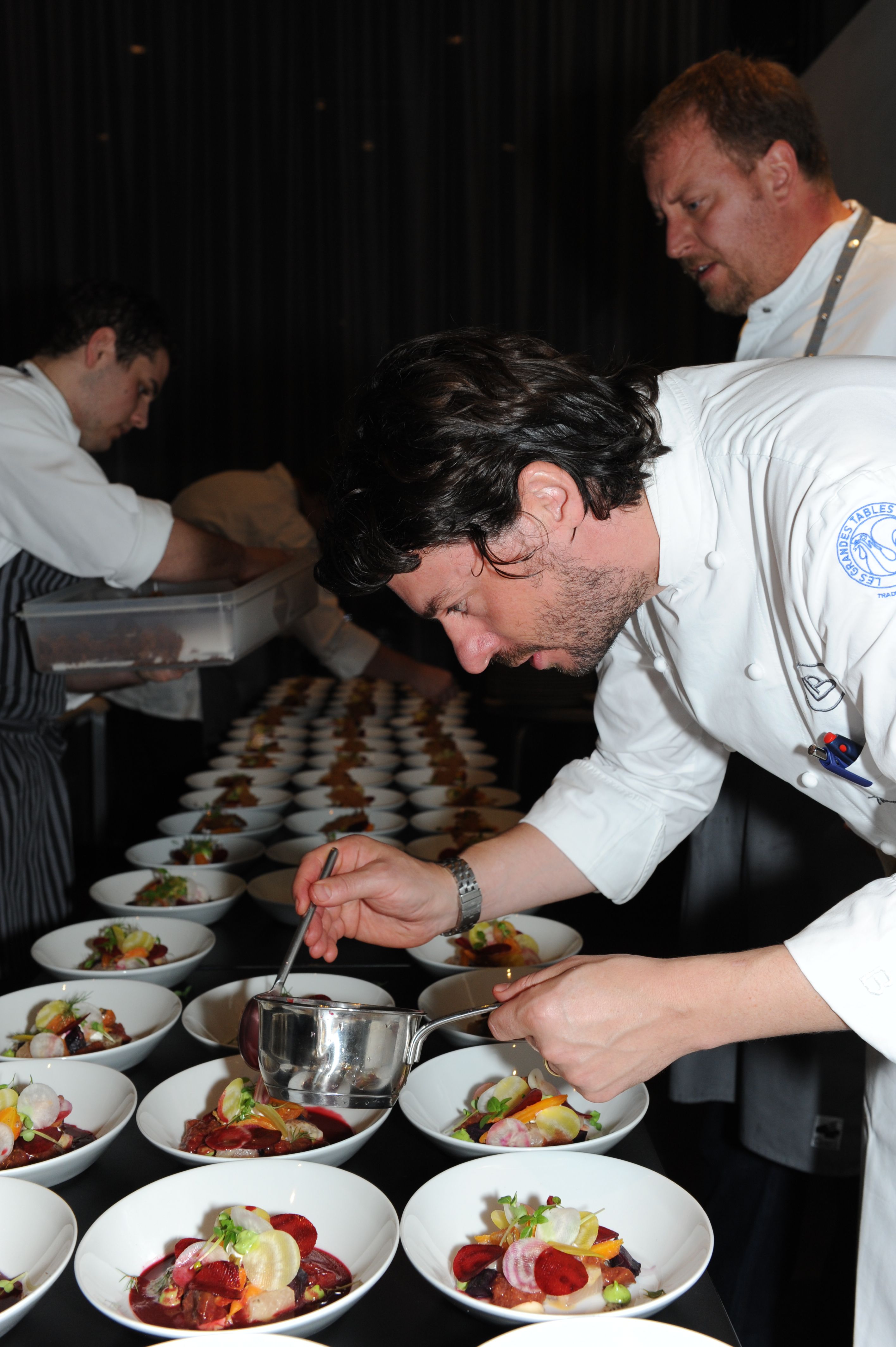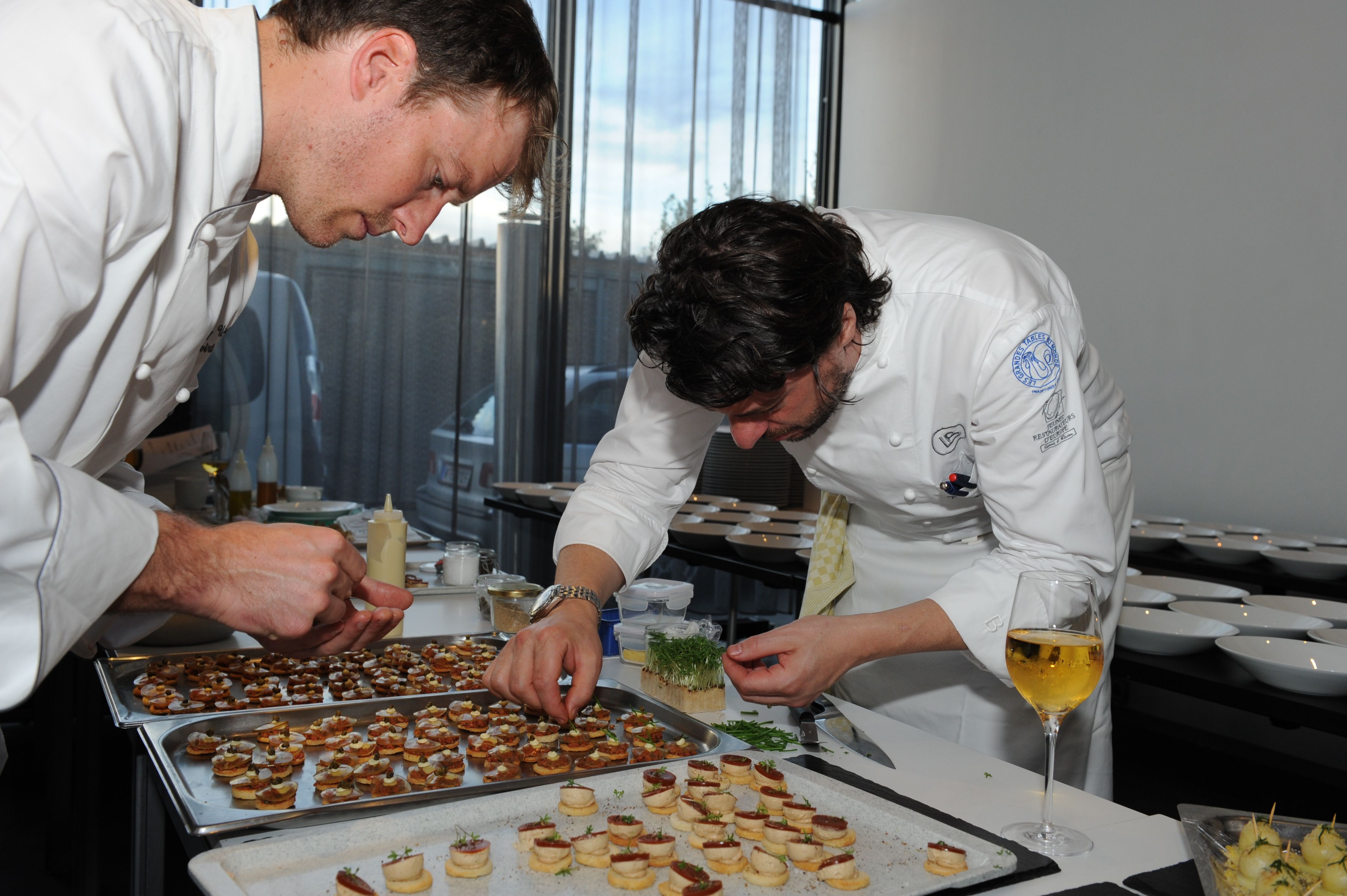 Auch kulinarisch sorgte der Abend für Begeisterung bei den Gästen: fünf Spitzenköche aus den Reihen der Jeunes Restaurateurs d’Europe Österreich servierten ein fulminantes Menü, begleitet von gereiften Weinen der Traditionsweingüter. Thomas Göls vom Restaurant Hill war für die kleinen Köstlichkeiten von confierten Erdäpfeln über Saiblingstartelett, Hilltatar und Gänseleber mit Hagebutte zum Aperitif zuständig. Thomas Dorfer, Genießerhotel Landhaus Bacher, servierte Seesaibling mit Rüben, eingekochten Feigen und Labneh. Von Thorsten Probost, Burg Vital Resort, kam der gedämpfte Zander auf geschmorter Gerste mit Kräutern und Sauce vom Grünen Veltliner, großes Kino war der (eigenhändig geschossene) rosa gebratene Hirsch mit Kürbis & Steinpilzen, von Hans Jörg Unterrainer und Fritz Braumüller, Kirchenwirt in Leogang. Josef Floh, Gastwirtschaft Floh, schließlich zeigte mit Demeter Gries-Röllchen und Weintrauben, dass ein Dessert nicht zuckersüß sein muss.