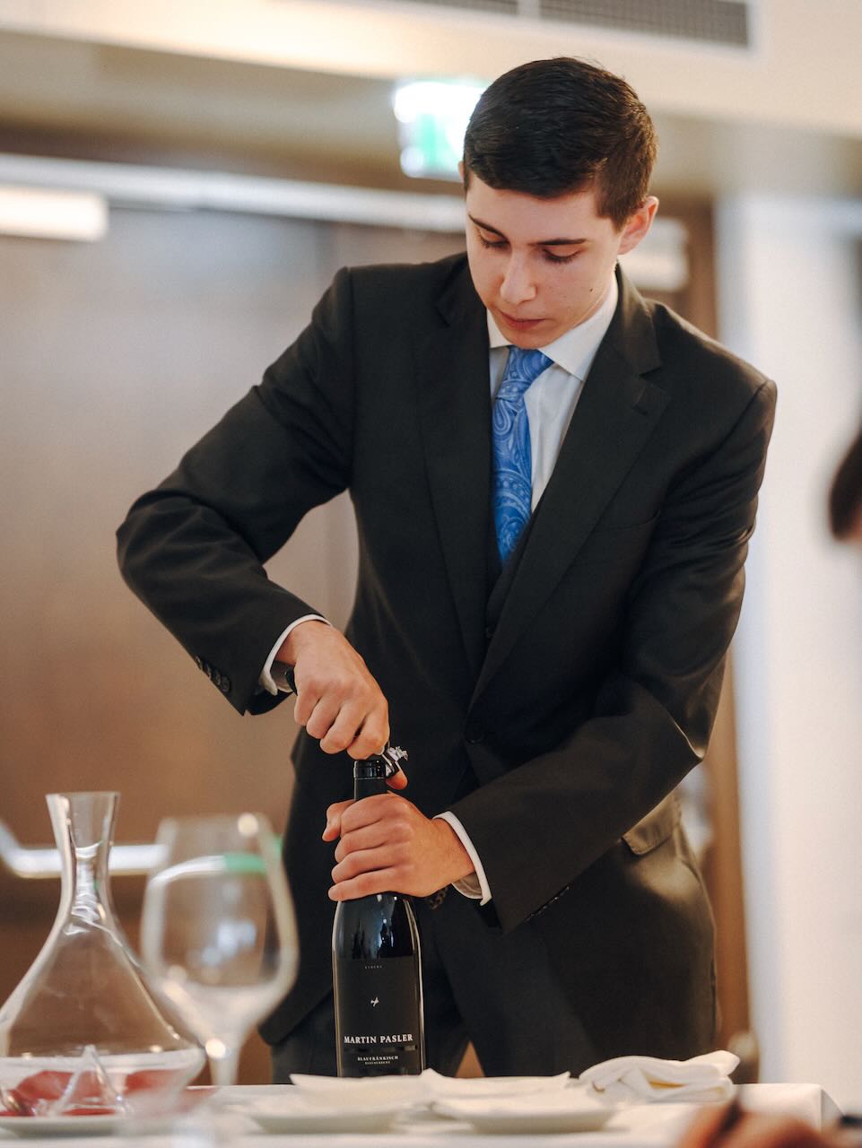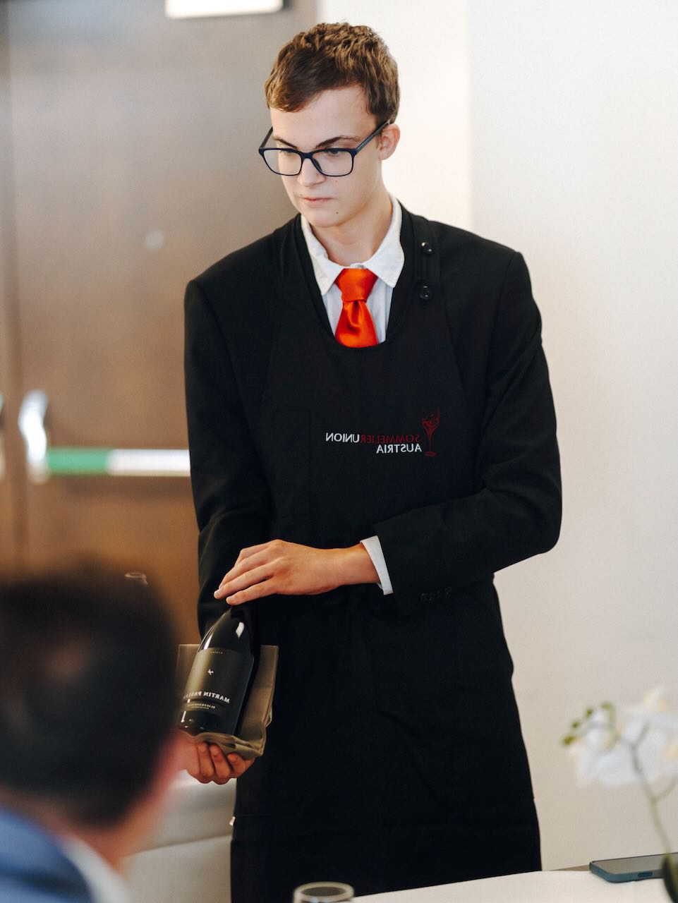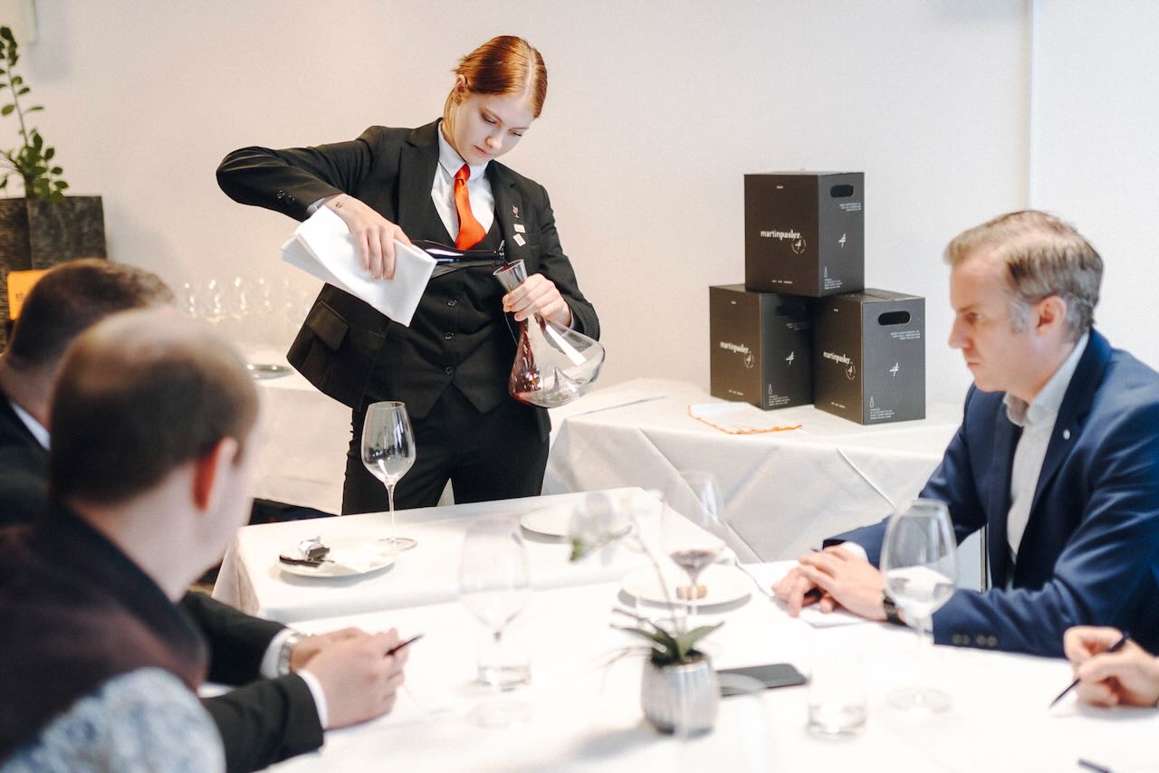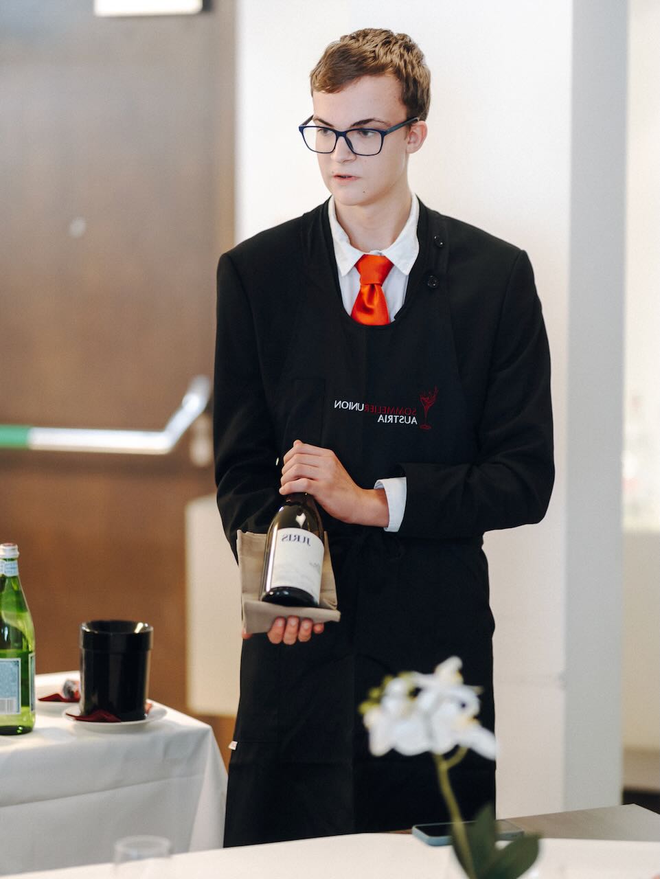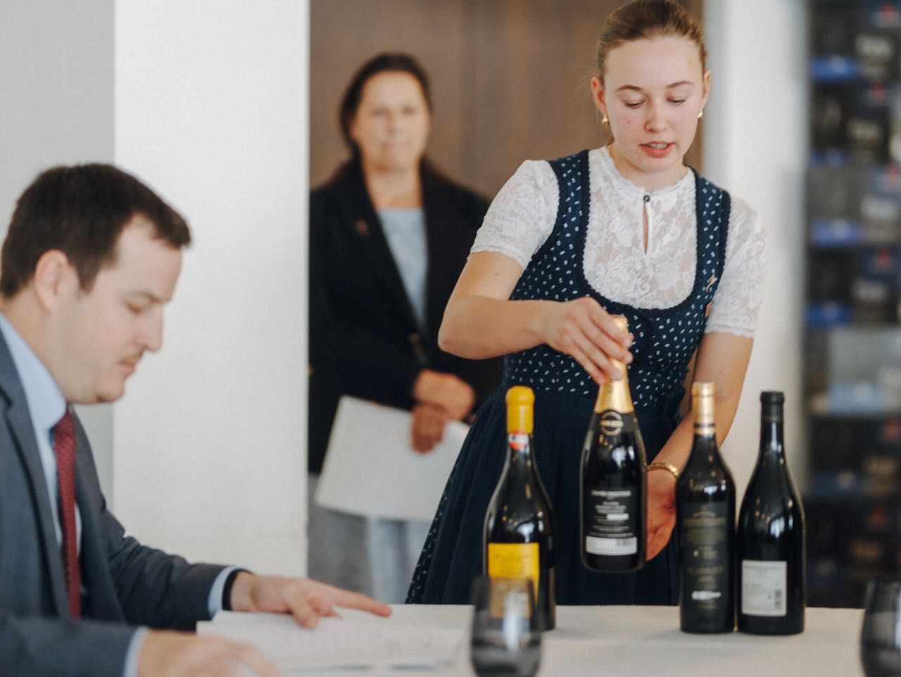 Als erste Aufgabe galt es einen umfassenden Fragebogen auszufüllen, der etwa die klassifizierten Rebsorten österreichischer DAC-Gebiete, das Benennen von Flaschengrößen, das Verorten von namhaften Rieden inklusive Winzer*in, Kellertechnik und allgemeine Getränkekunde umfasste. Beim praktischen Teil war eine Flasche Rotwein zu servieren und auf den kniffligen Änderungswunsch eines Gastes einzugehen.