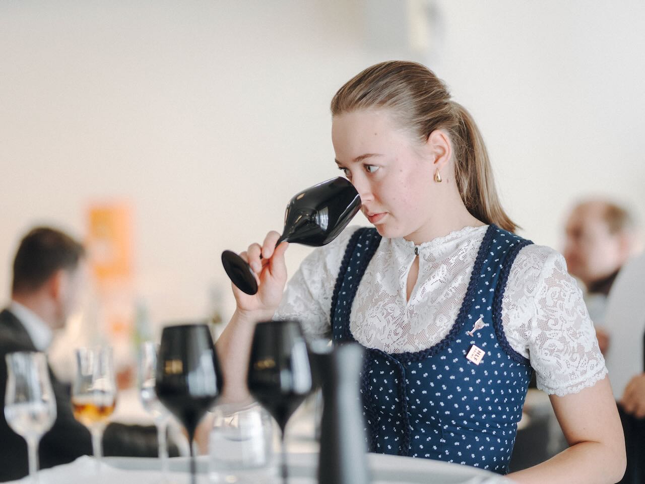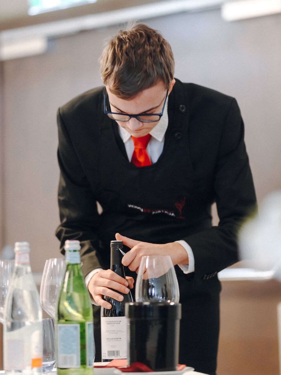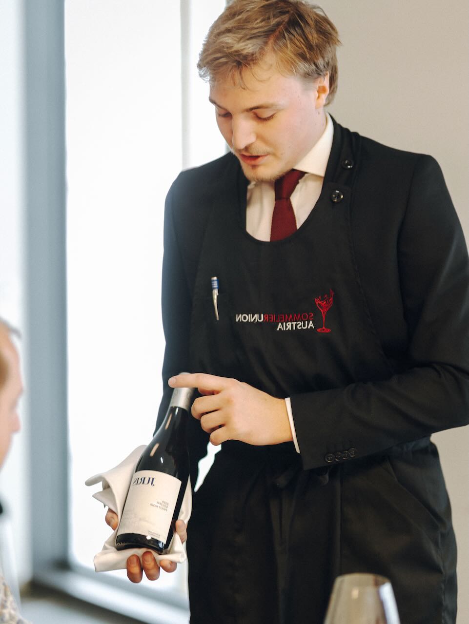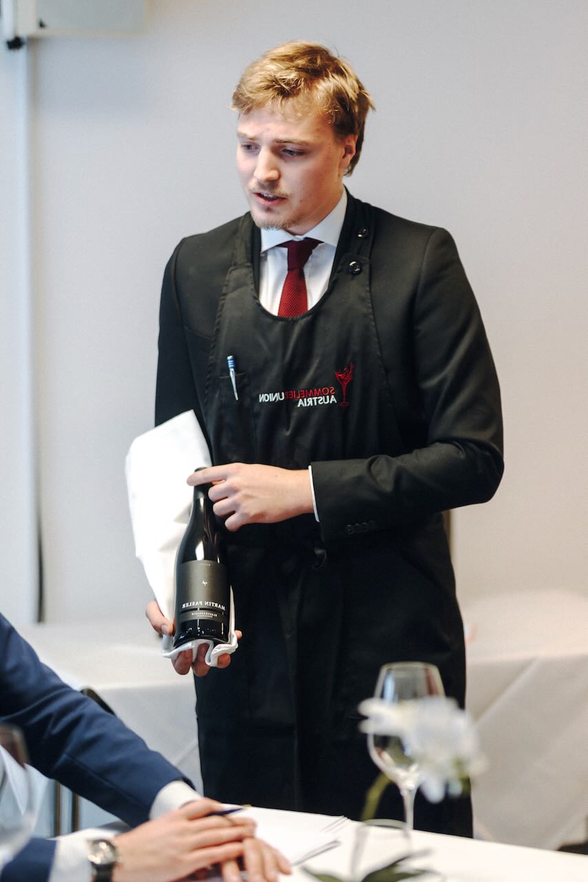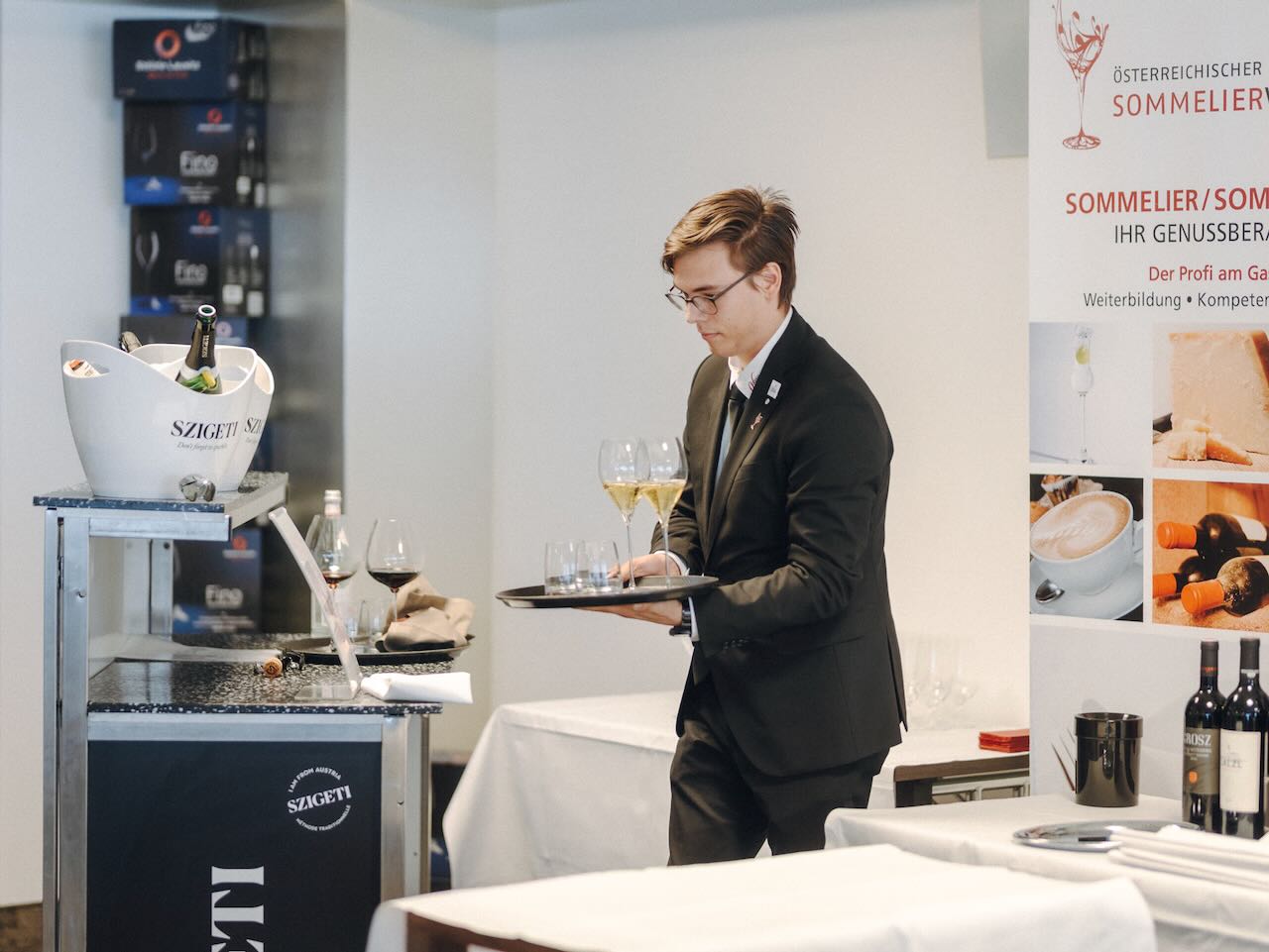 Als erste Aufgabe galt es einen umfassenden Fragebogen auszufüllen, der etwa die klassifizierten Rebsorten österreichischer DAC-Gebiete, das Benennen von Flaschengrößen, das Verorten von namhaften Rieden inklusive Winzer*in, Kellertechnik und allgemeine Getränkekunde umfasste. Beim praktischen Teil war eine Flasche Rotwein zu servieren und auf den kniffligen Änderungswunsch eines Gastes einzugehen.