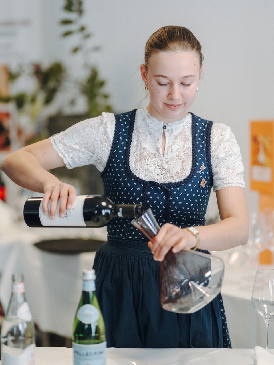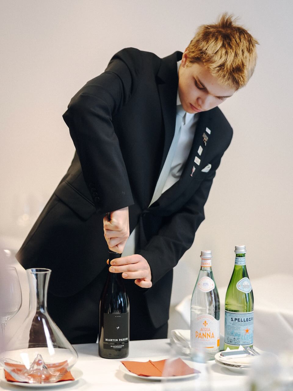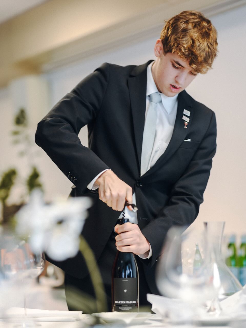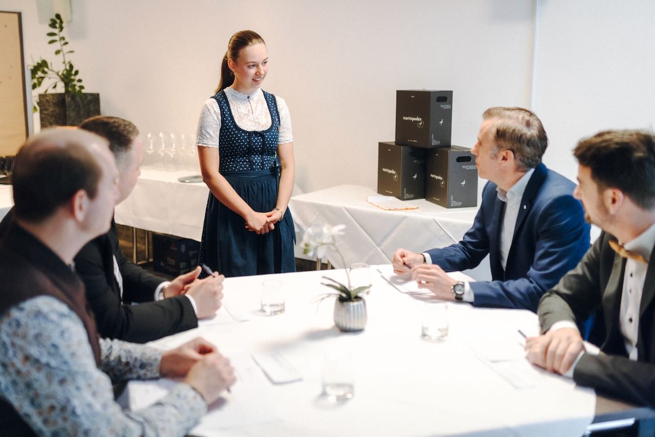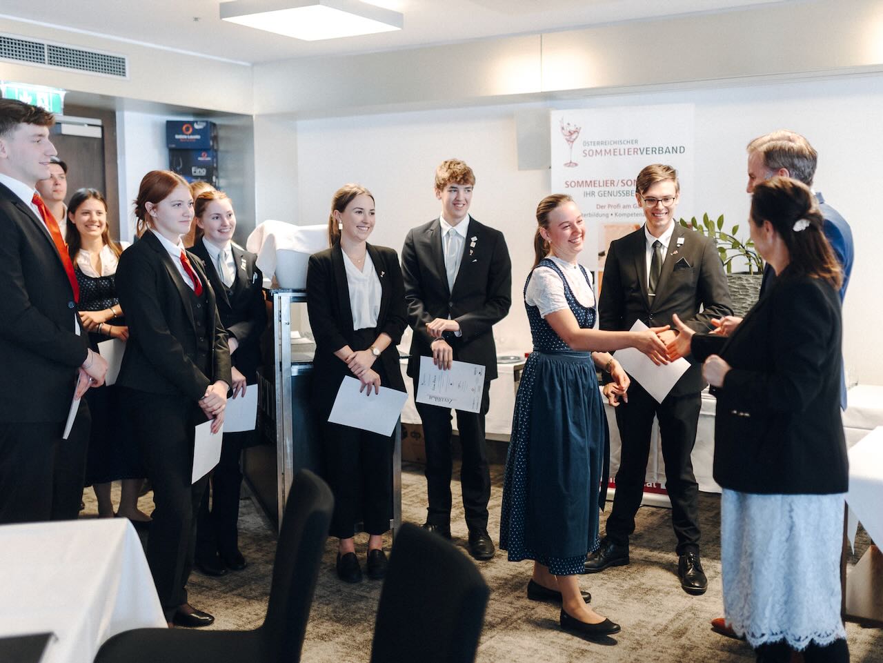 Als erste Aufgabe galt es einen umfassenden Fragebogen auszufüllen, der etwa die klassifizierten Rebsorten österreichischer DAC-Gebiete, das Benennen von Flaschengrößen, das Verorten von namhaften Rieden inklusive Winzer*in, Kellertechnik und allgemeine Getränkekunde umfasste. Beim praktischen Teil war eine Flasche Rotwein zu servieren und auf den kniffligen Änderungswunsch eines Gastes einzugehen.