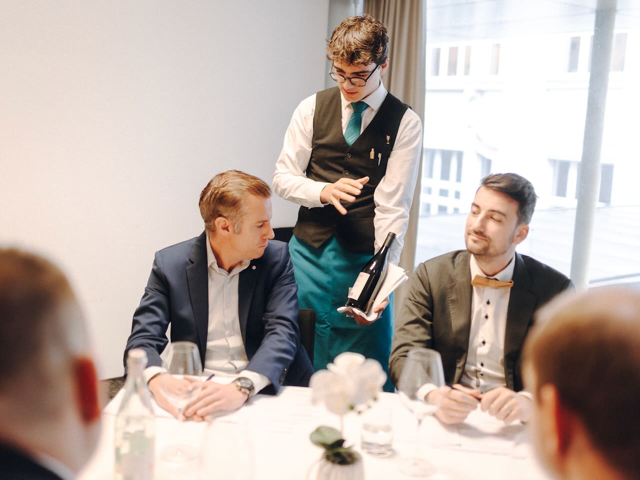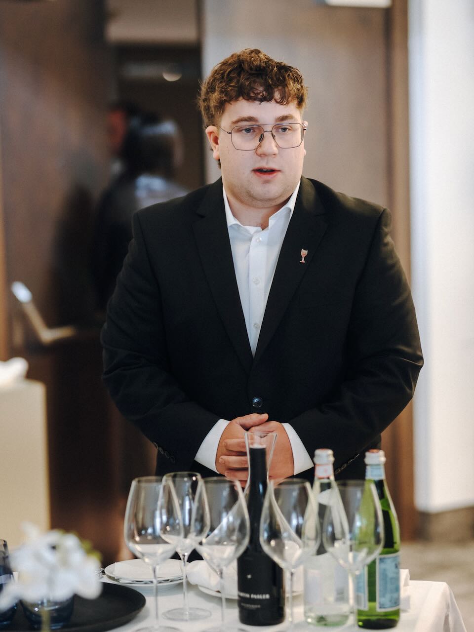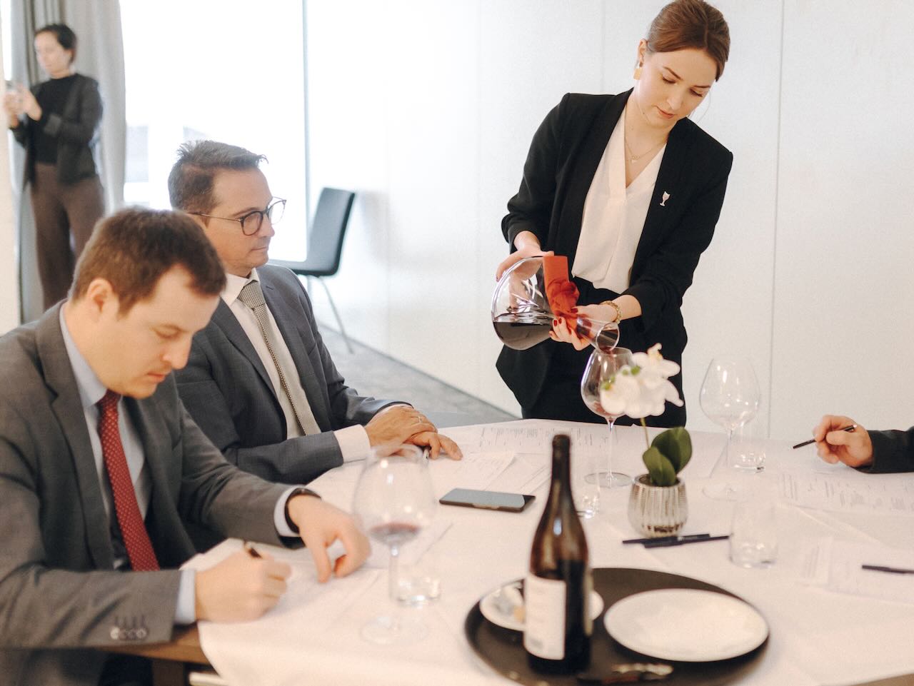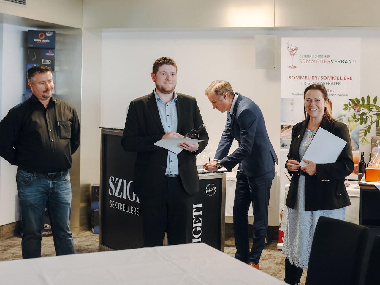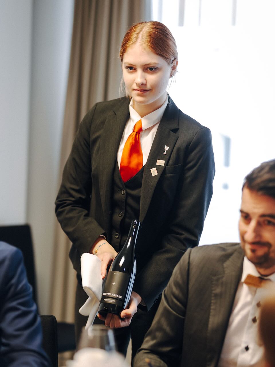 Als erste Aufgabe galt es einen umfassenden Fragebogen auszufüllen, der etwa die klassifizierten Rebsorten österreichischer DAC-Gebiete, das Benennen von Flaschengrößen, das Verorten von namhaften Rieden inklusive Winzer*in, Kellertechnik und allgemeine Getränkekunde umfasste. Beim praktischen Teil war eine Flasche Rotwein zu servieren und auf den kniffligen Änderungswunsch eines Gastes einzugehen.