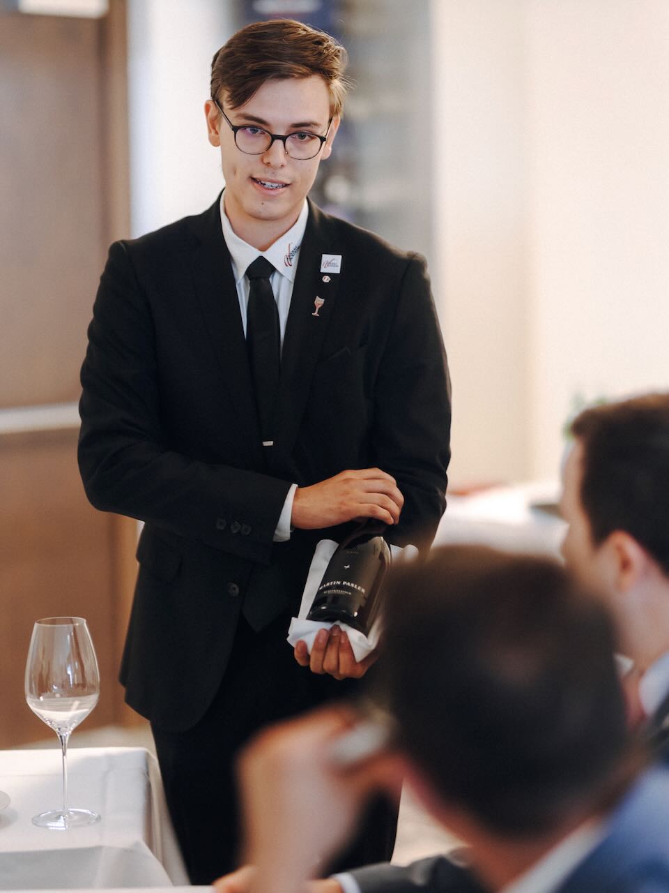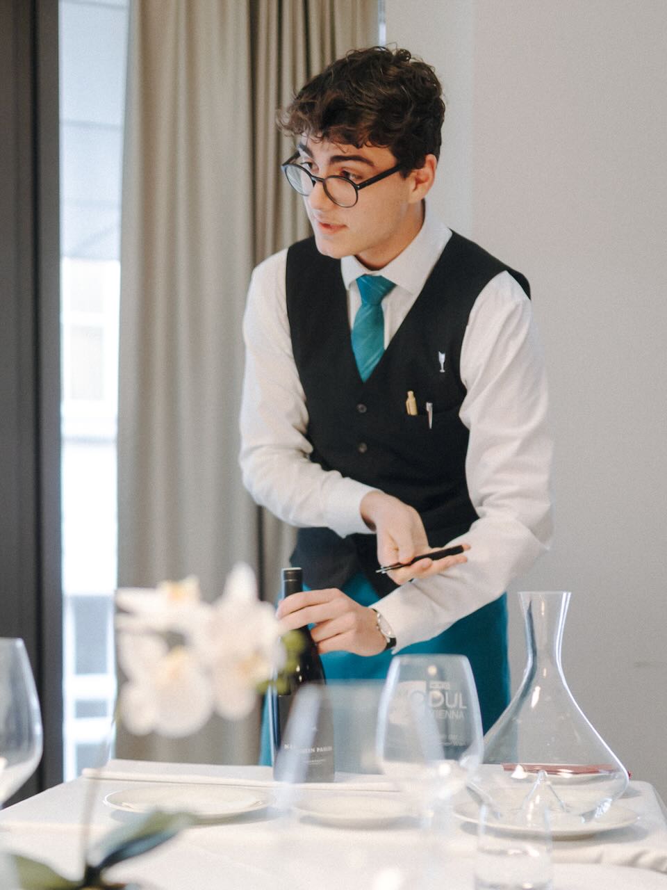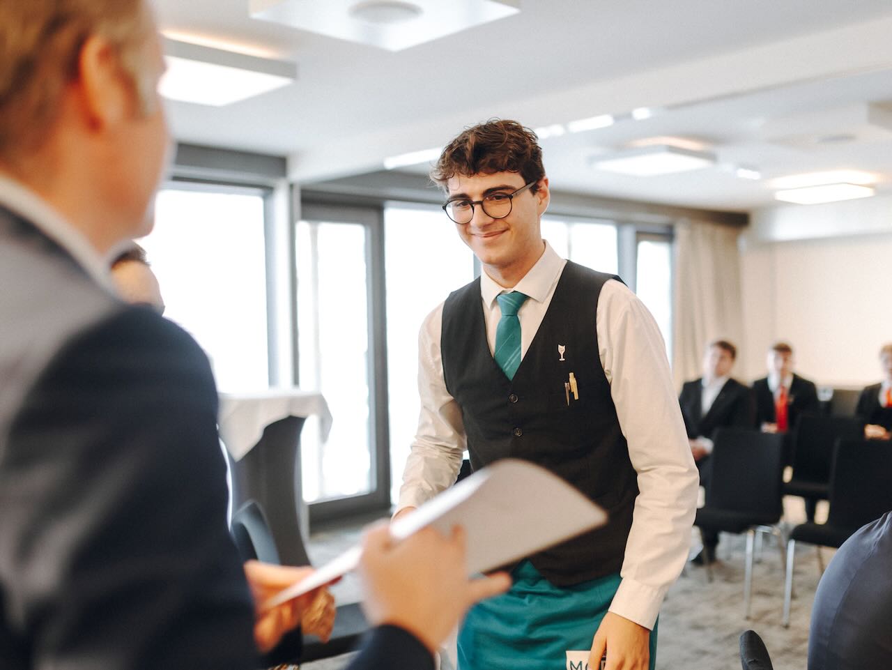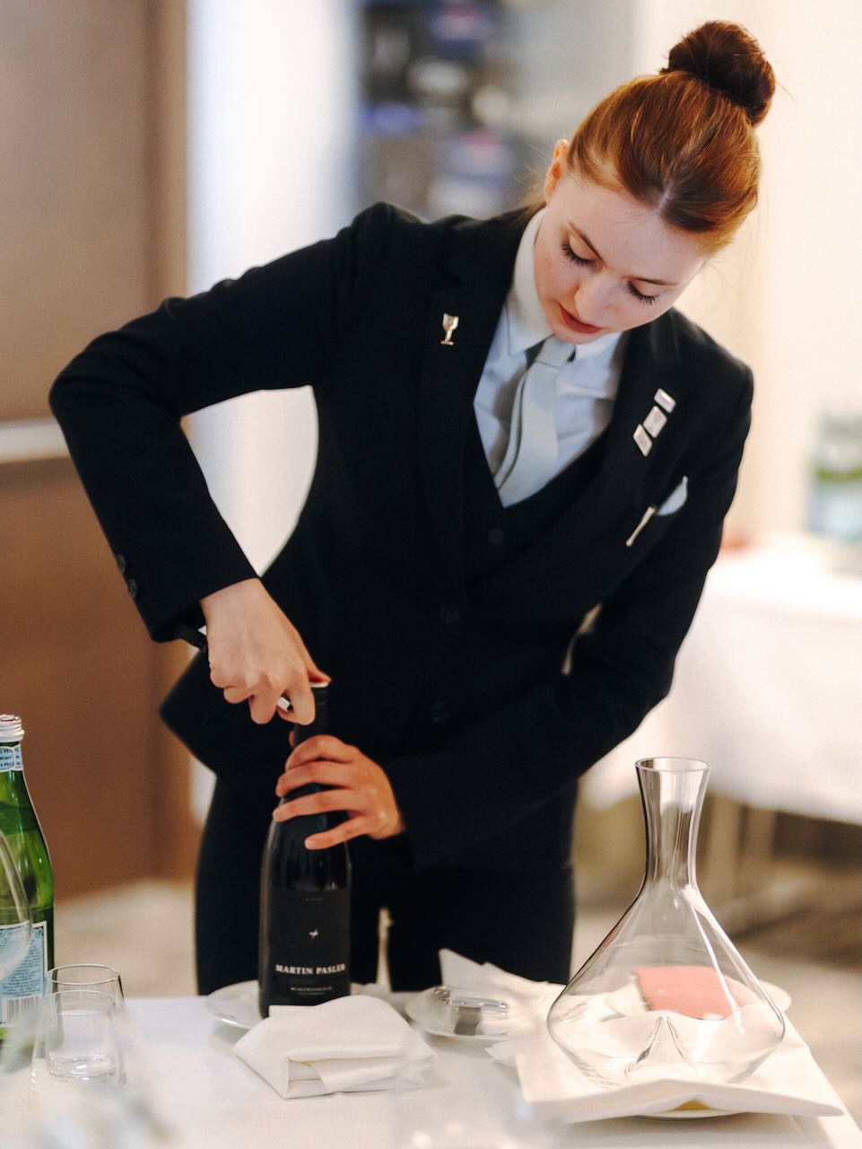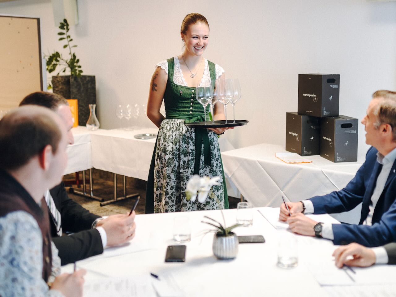 Als erste Aufgabe galt es einen umfassenden Fragebogen auszufüllen, der etwa die klassifizierten Rebsorten österreichischer DAC-Gebiete, das Benennen von Flaschengrößen, das Verorten von namhaften Rieden inklusive Winzer*in, Kellertechnik und allgemeine Getränkekunde umfasste. Beim praktischen Teil war eine Flasche Rotwein zu servieren und auf den kniffligen Änderungswunsch eines Gastes einzugehen.