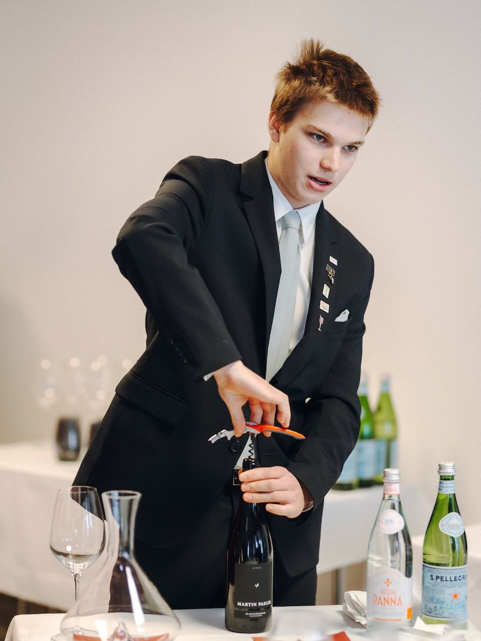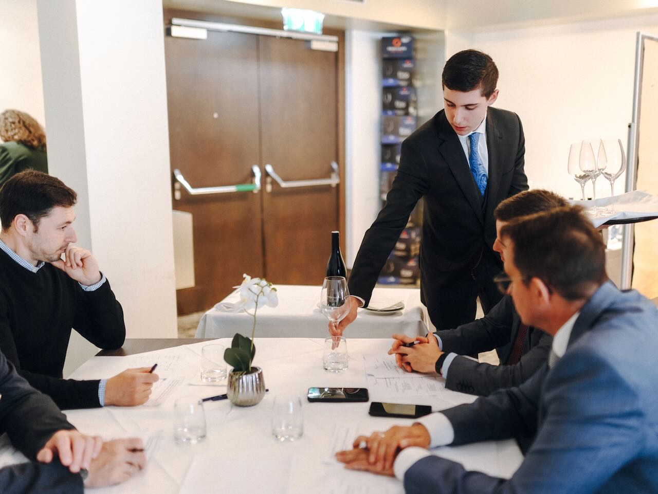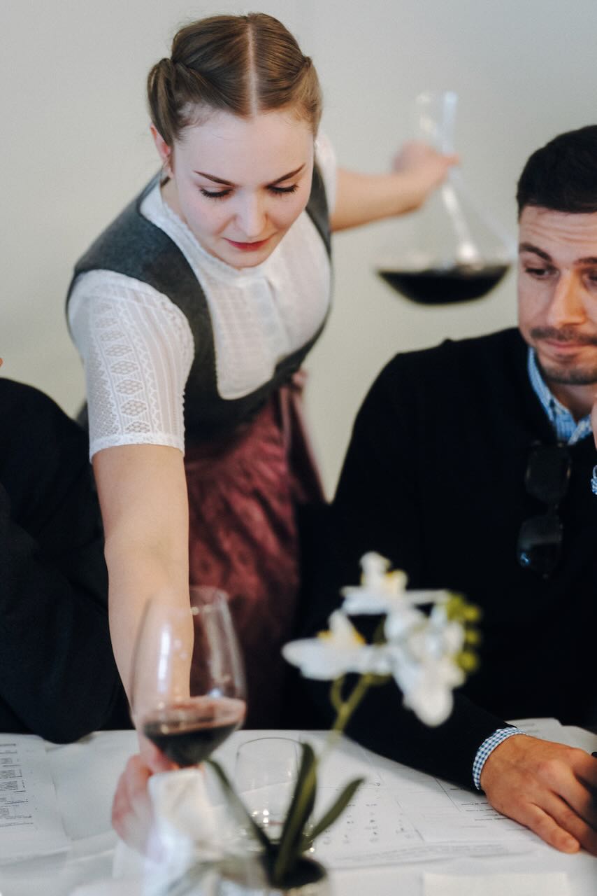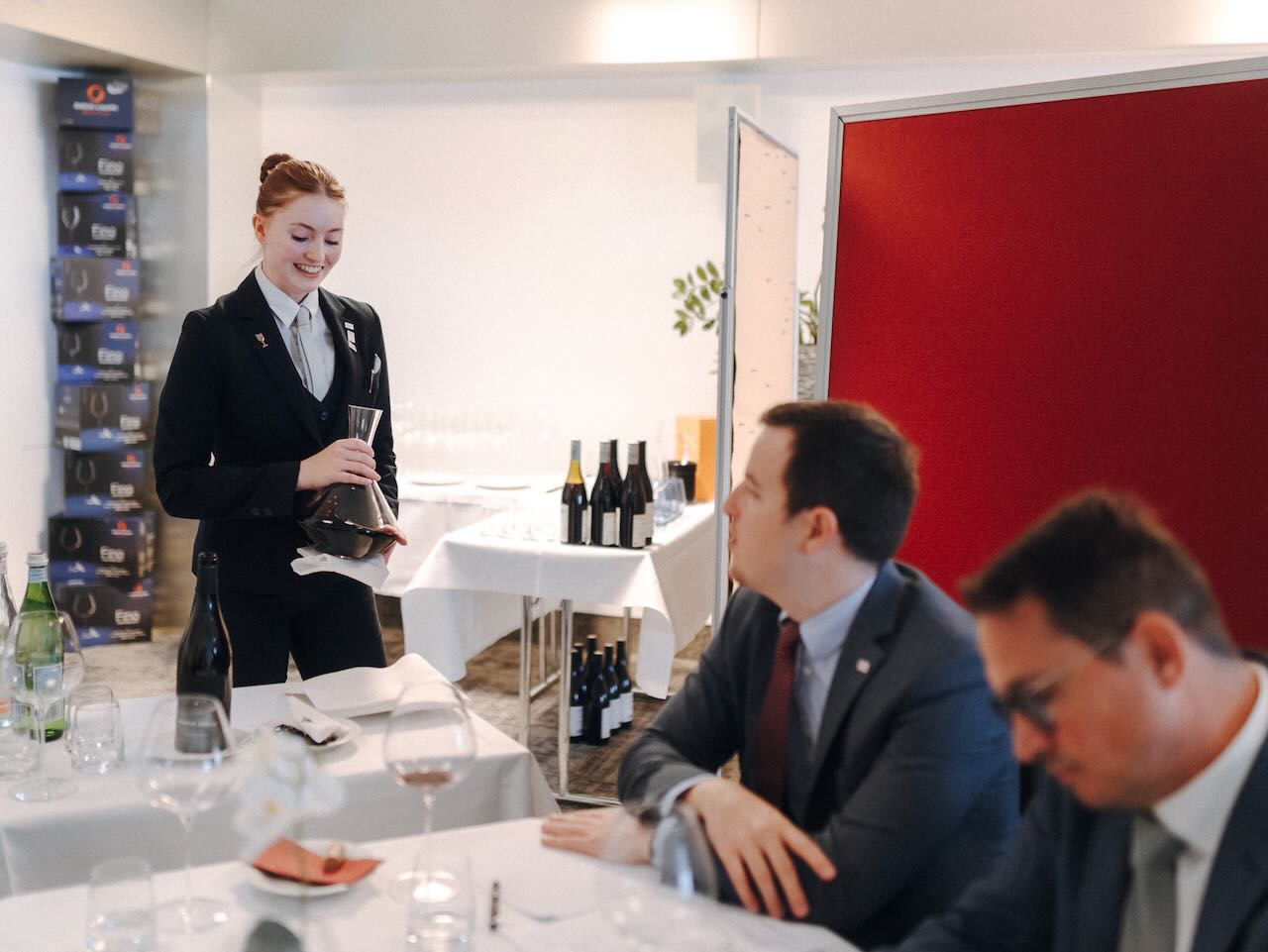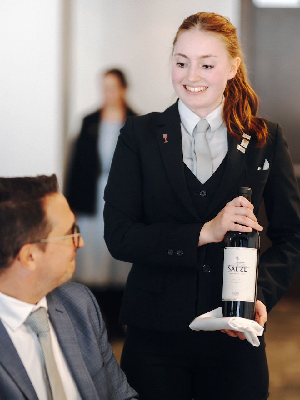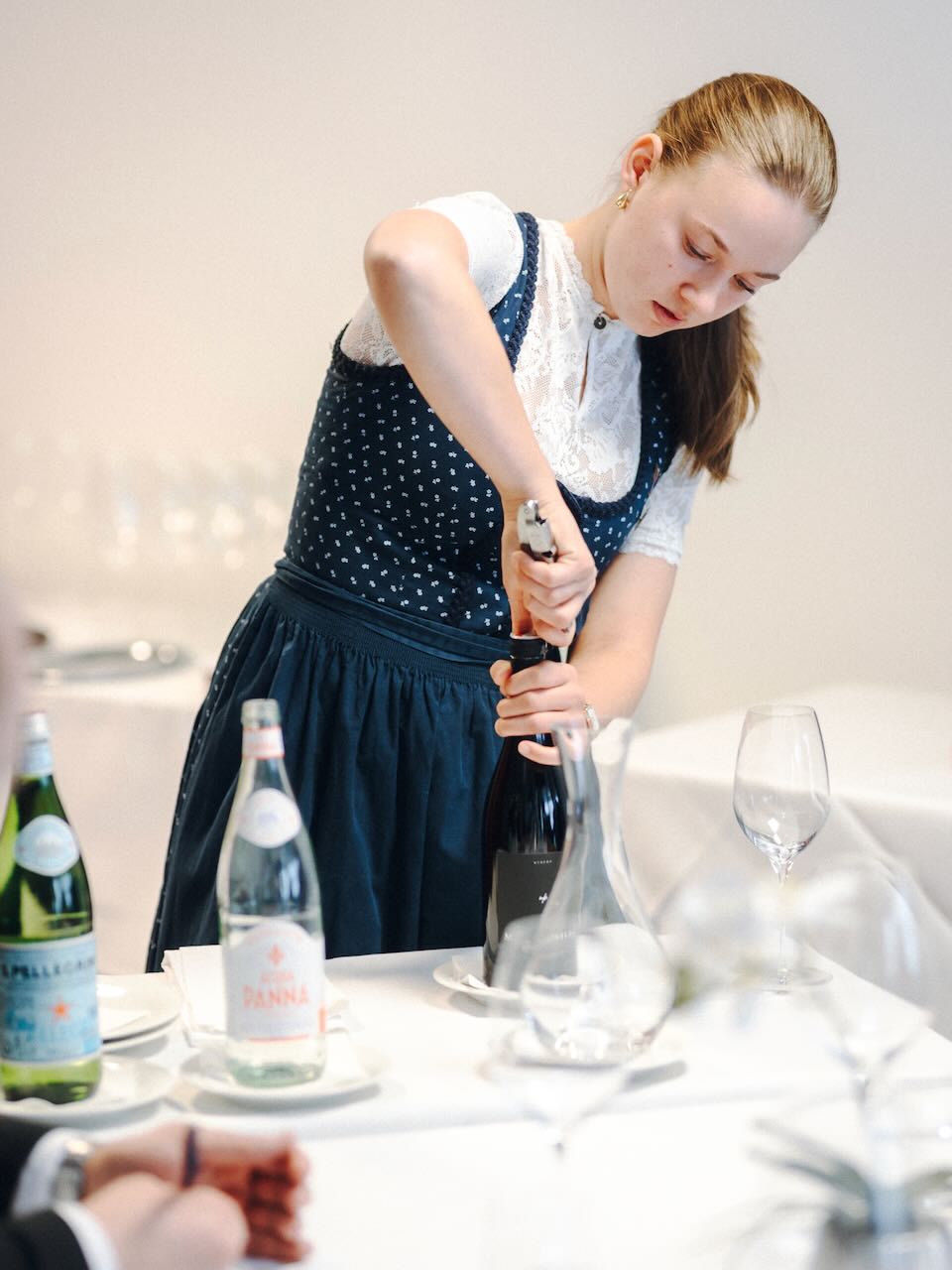 Als erste Aufgabe galt es einen umfassenden Fragebogen auszufüllen, der etwa die klassifizierten Rebsorten österreichischer DAC-Gebiete, das Benennen von Flaschengrößen, das Verorten von namhaften Rieden inklusive Winzer*in, Kellertechnik und allgemeine Getränkekunde umfasste. Beim praktischen Teil war eine Flasche Rotwein zu servieren und auf den kniffligen Änderungswunsch eines Gastes einzugehen.