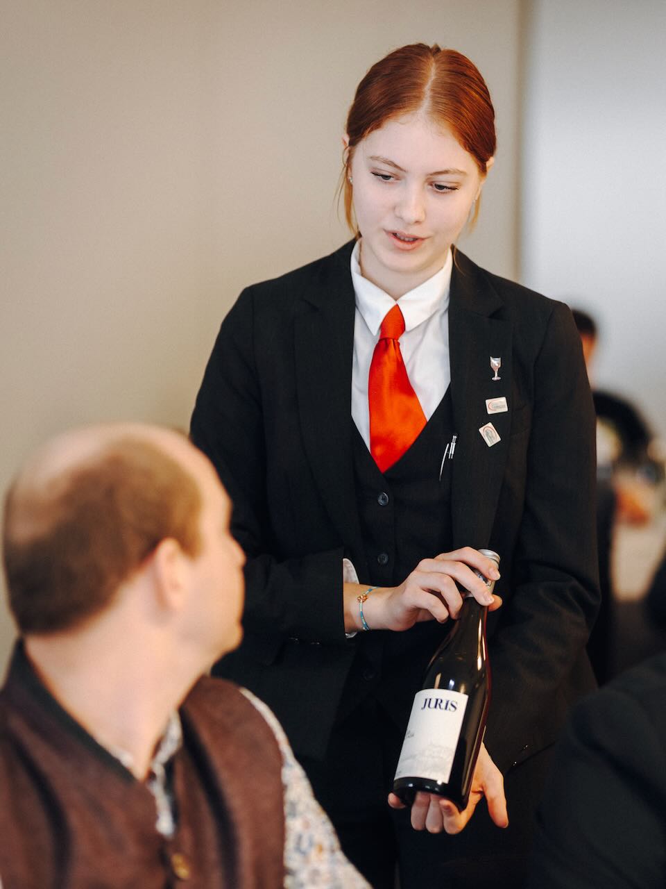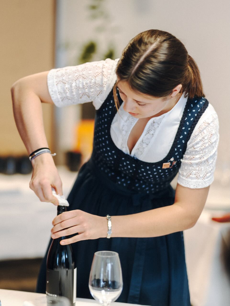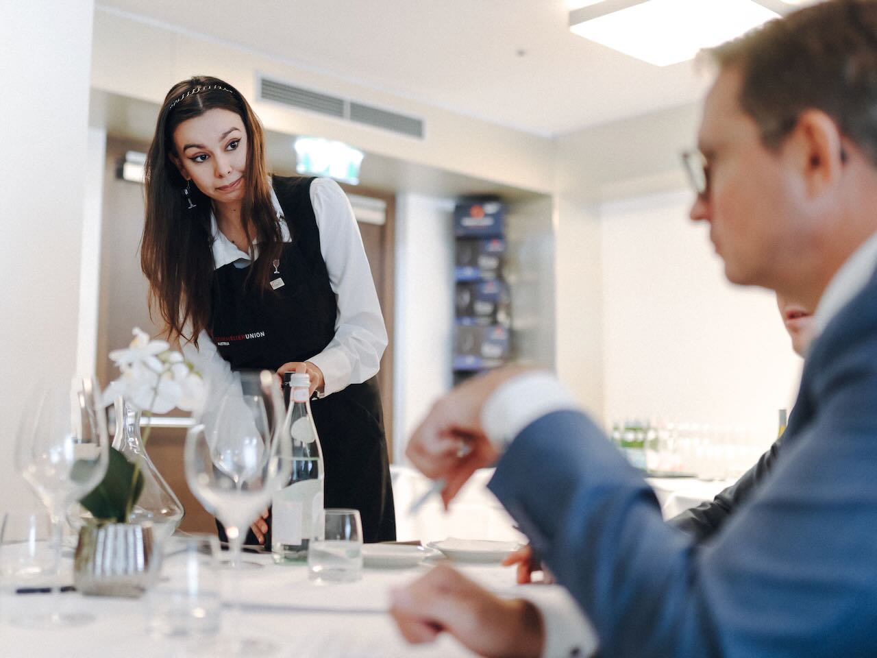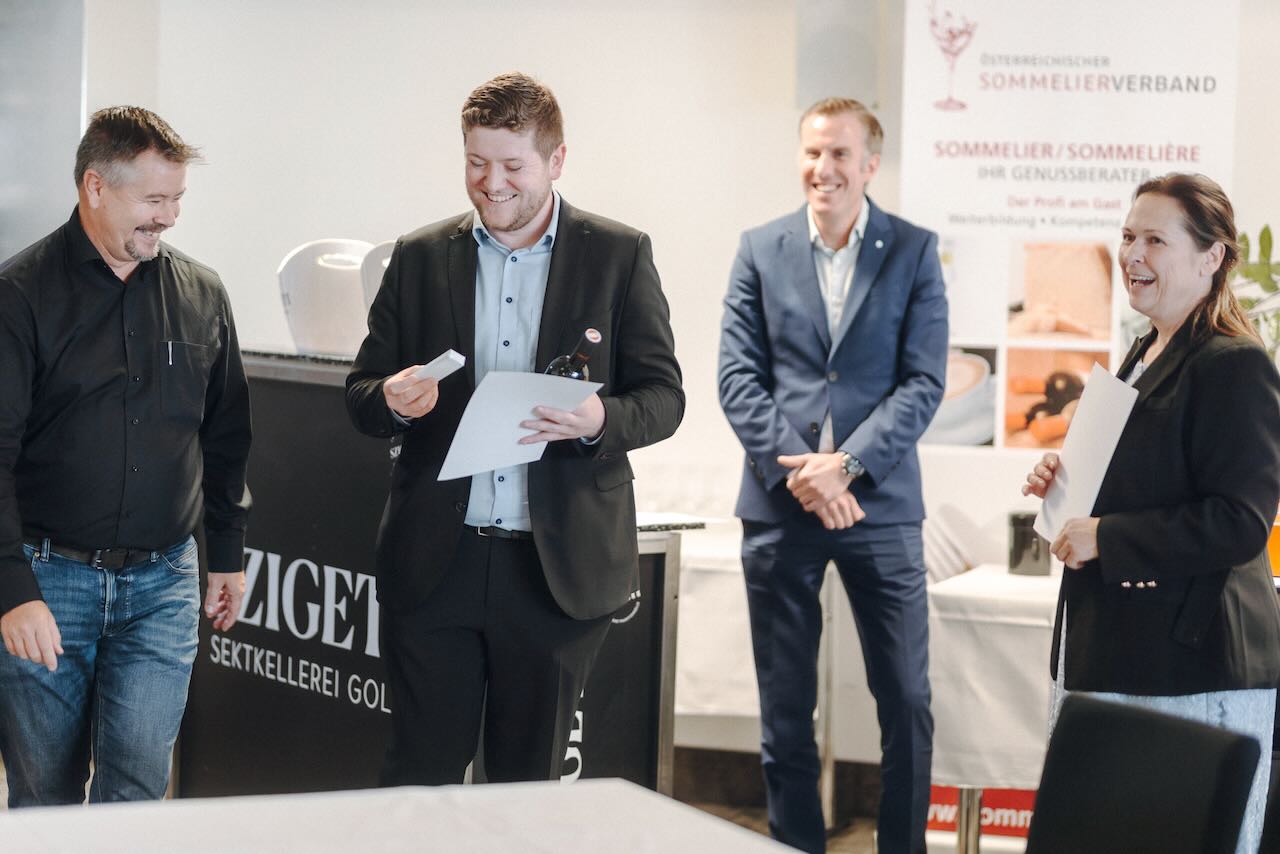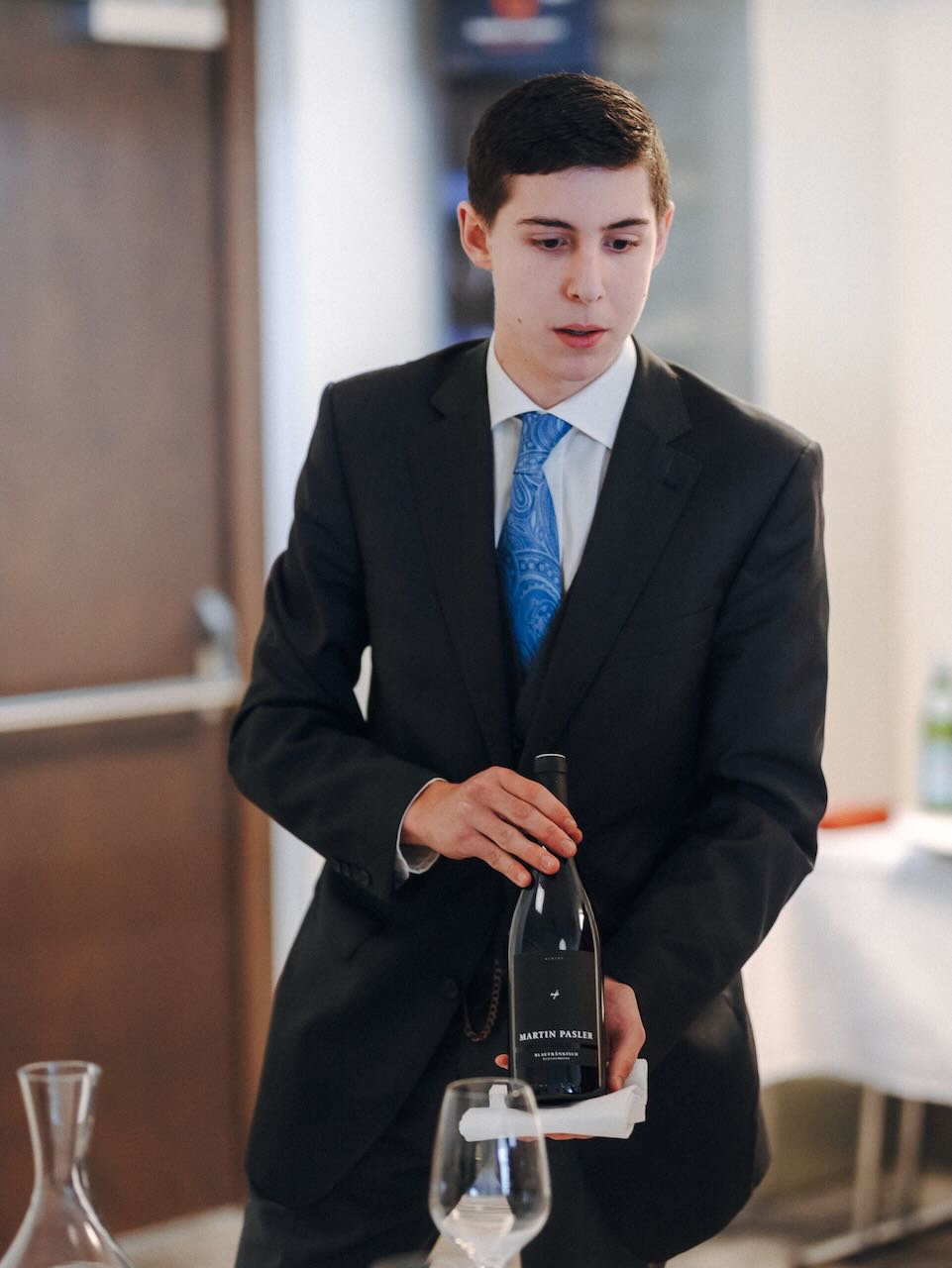 Als erste Aufgabe galt es einen umfassenden Fragebogen auszufüllen, der etwa die klassifizierten Rebsorten österreichischer DAC-Gebiete, das Benennen von Flaschengrößen, das Verorten von namhaften Rieden inklusive Winzer*in, Kellertechnik und allgemeine Getränkekunde umfasste. Beim praktischen Teil war eine Flasche Rotwein zu servieren und auf den kniffligen Änderungswunsch eines Gastes einzugehen.