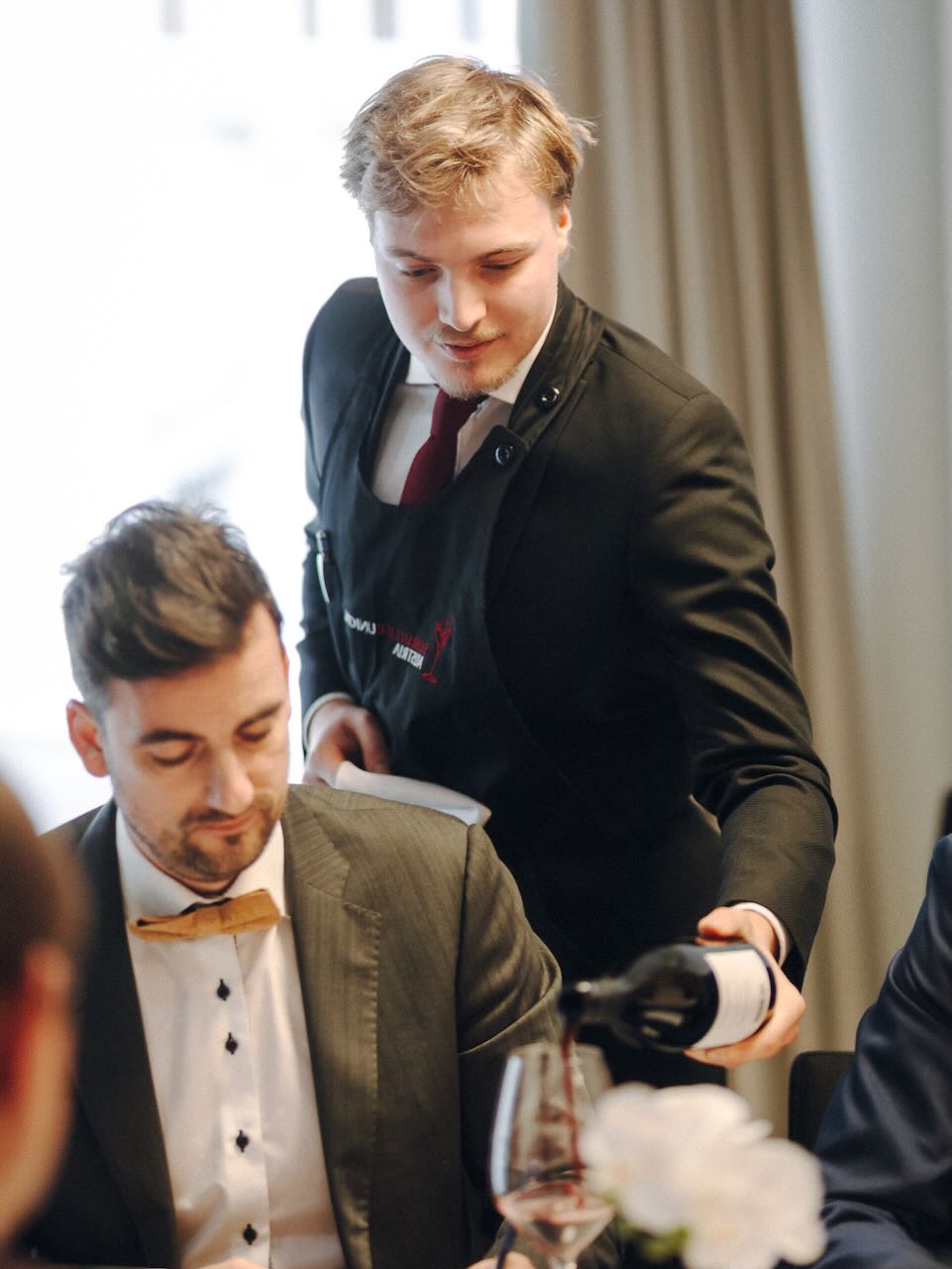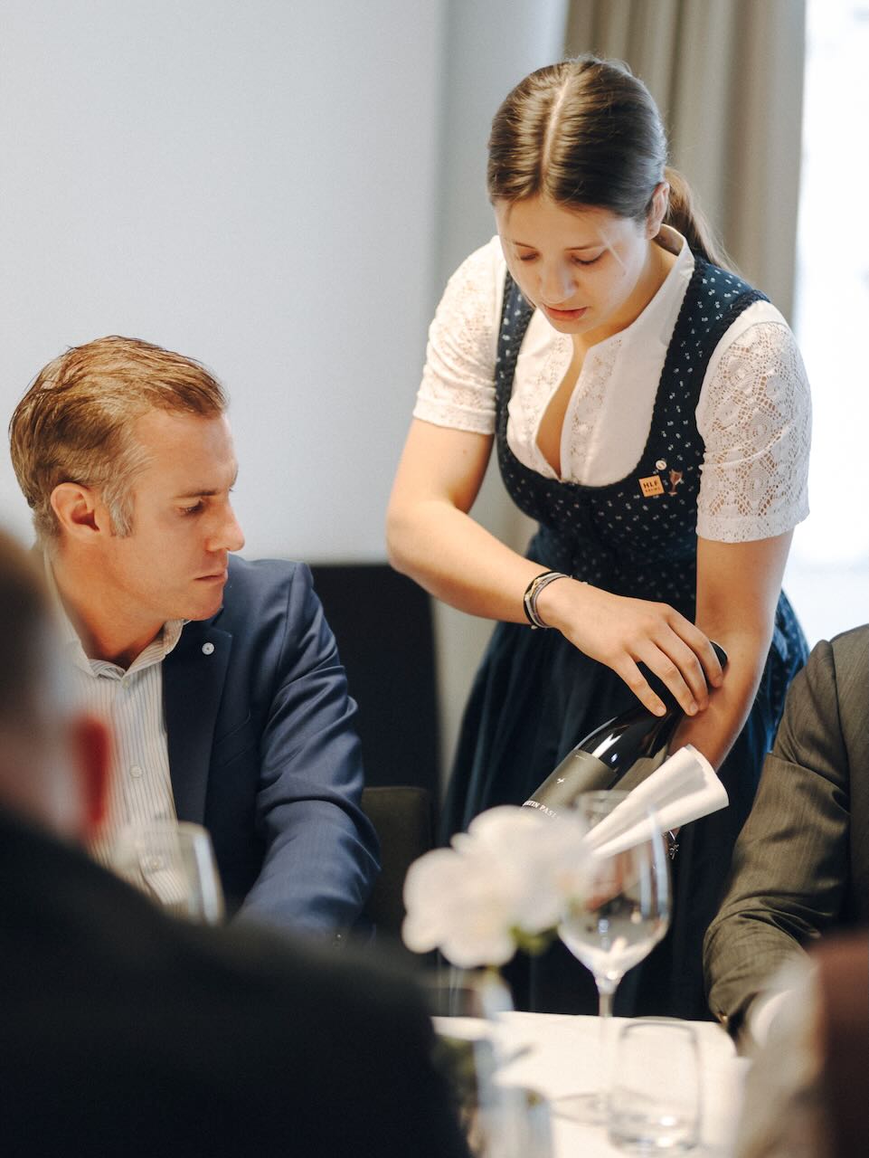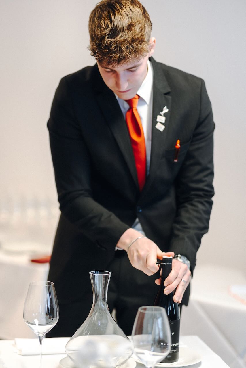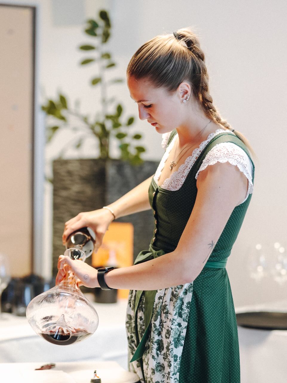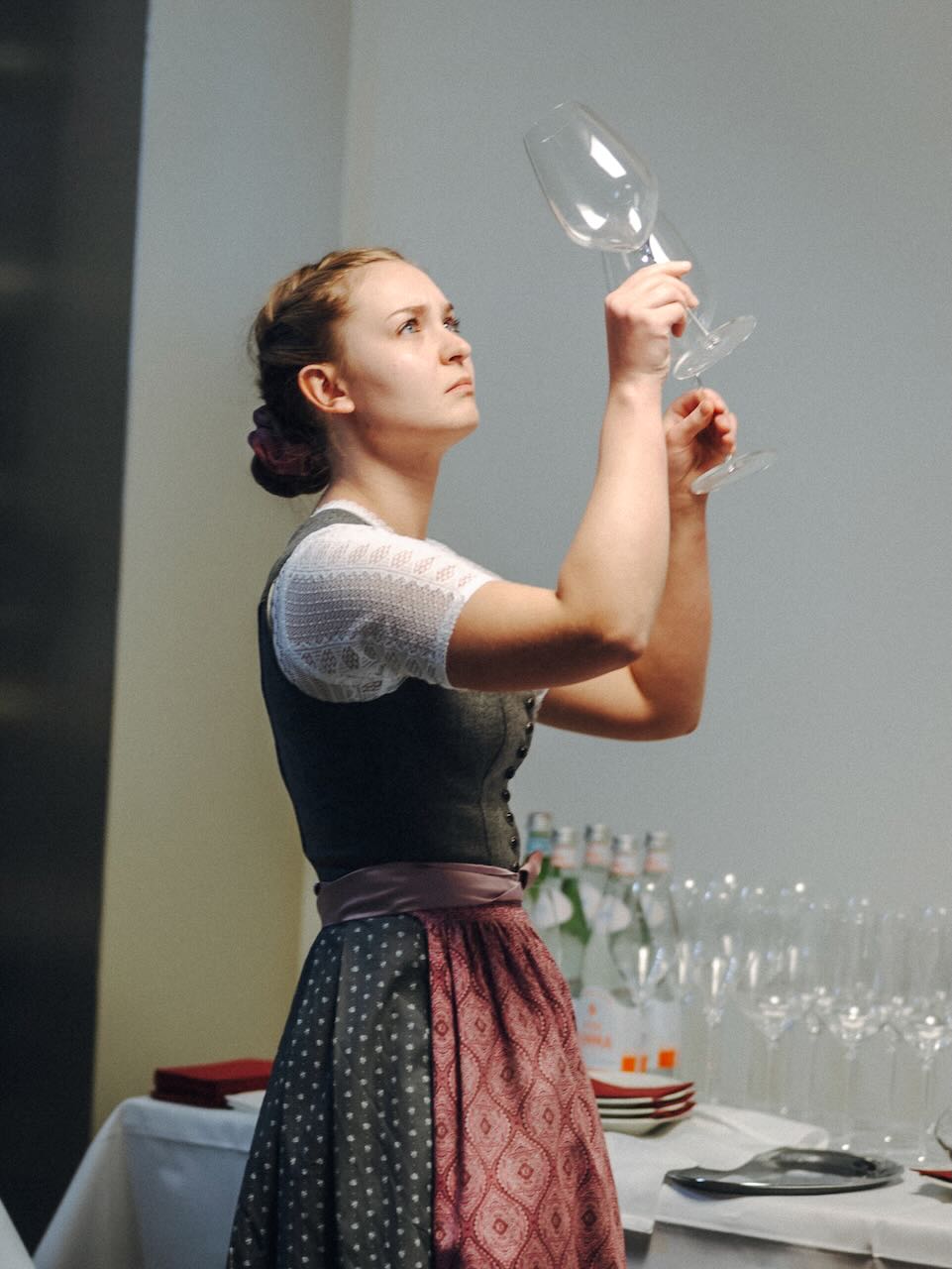 Als erste Aufgabe galt es einen umfassenden Fragebogen auszufüllen, der etwa die klassifizierten Rebsorten österreichischer DAC-Gebiete, das Benennen von Flaschengrößen, das Verorten von namhaften Rieden inklusive Winzer*in, Kellertechnik und allgemeine Getränkekunde umfasste. Beim praktischen Teil war eine Flasche Rotwein zu servieren und auf den kniffligen Änderungswunsch eines Gastes einzugehen.