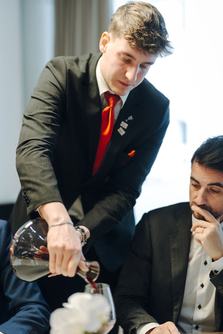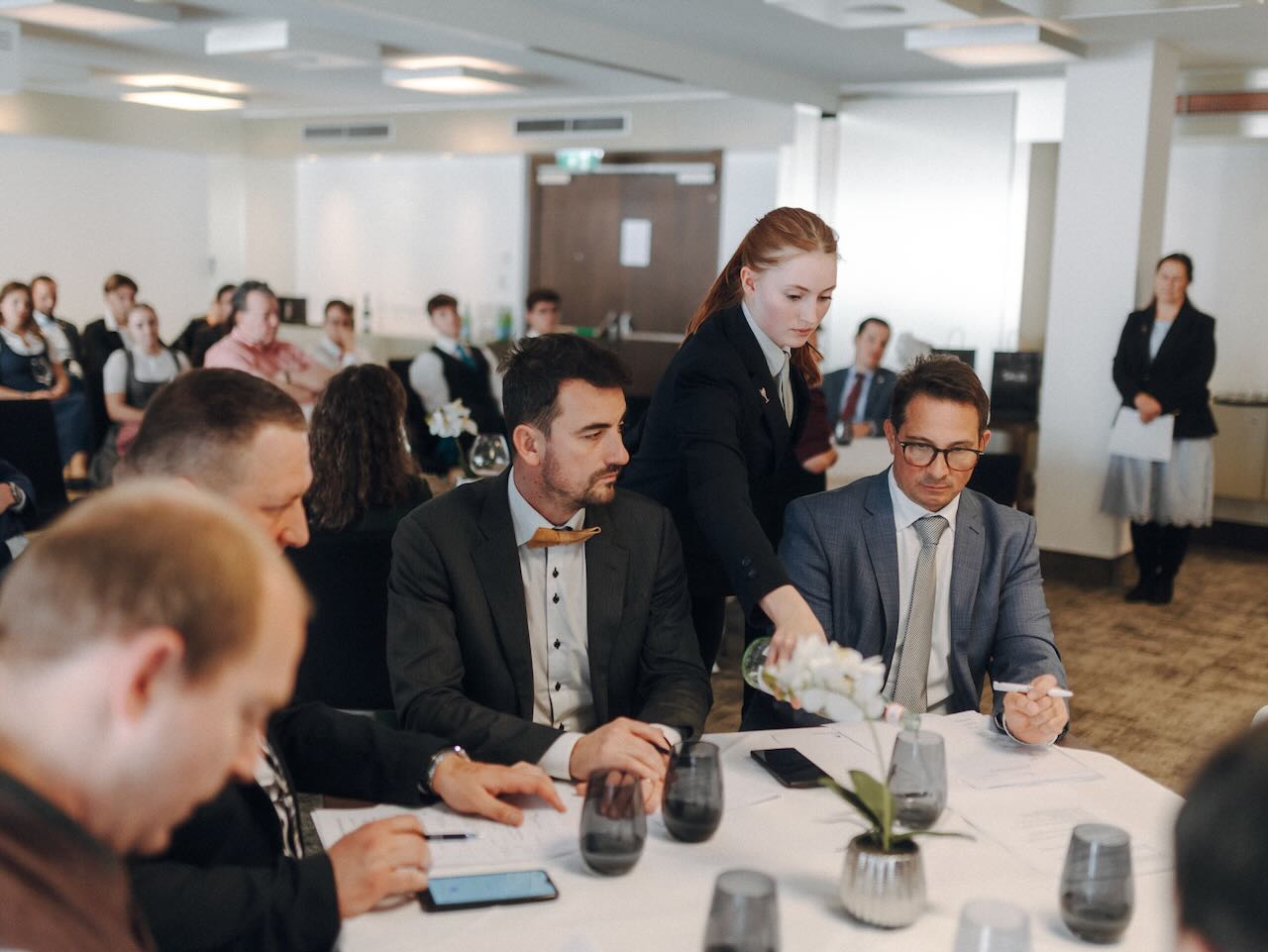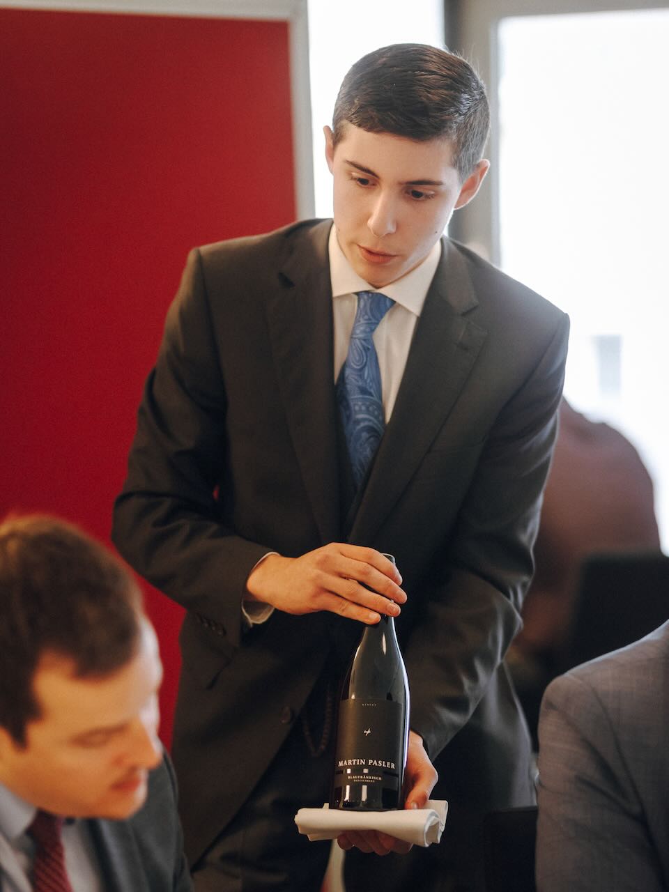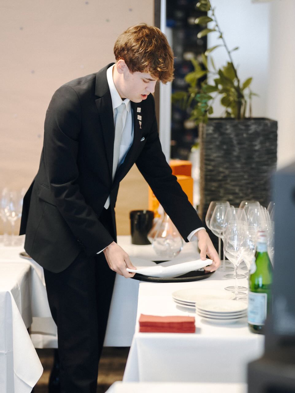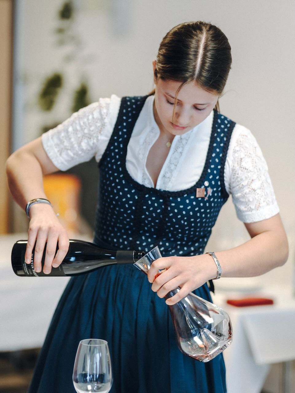 Als erste Aufgabe galt es einen umfassenden Fragebogen auszufüllen, der etwa die klassifizierten Rebsorten österreichischer DAC-Gebiete, das Benennen von Flaschengrößen, das Verorten von namhaften Rieden inklusive Winzer*in, Kellertechnik und allgemeine Getränkekunde umfasste. Beim praktischen Teil war eine Flasche Rotwein zu servieren und auf den kniffligen Änderungswunsch eines Gastes einzugehen.