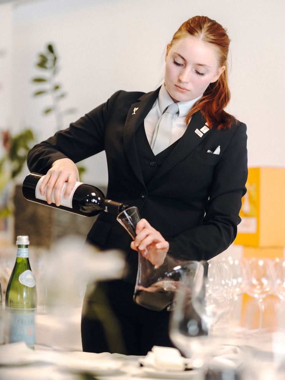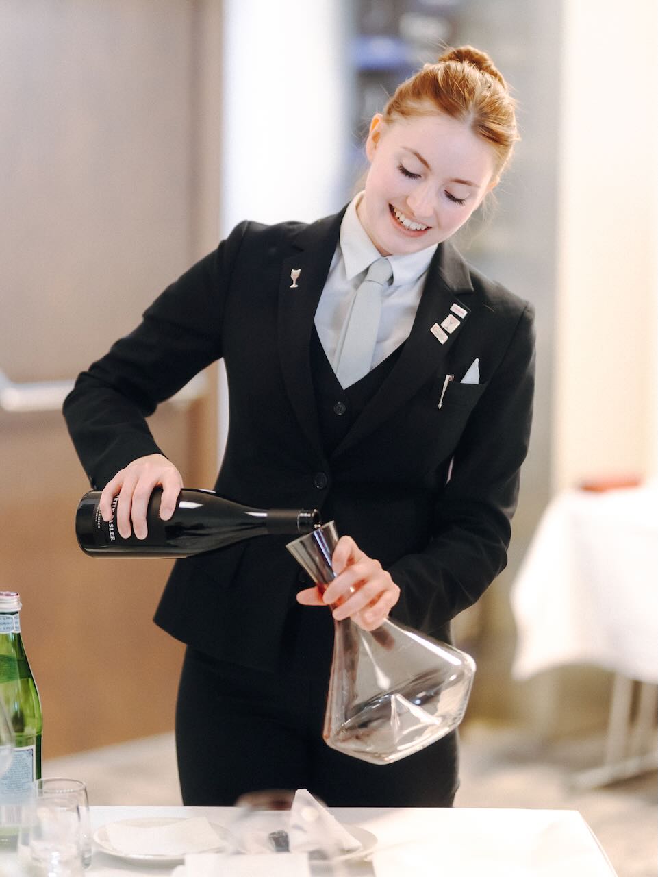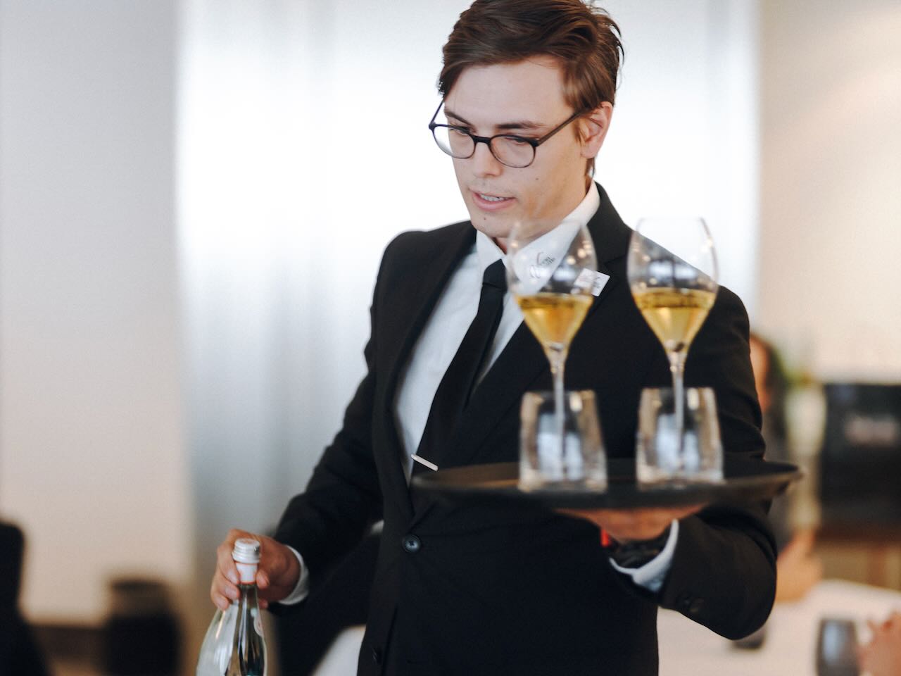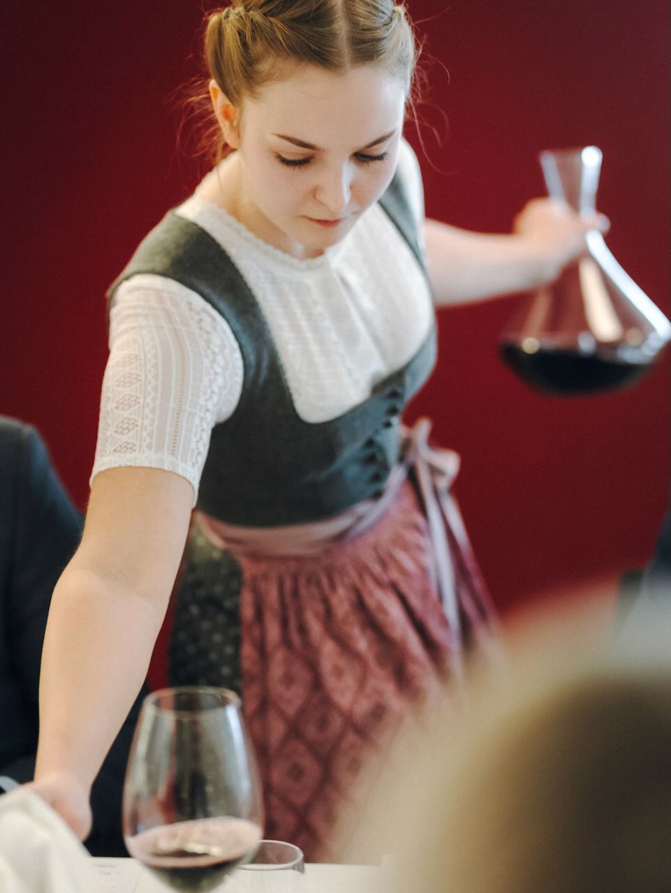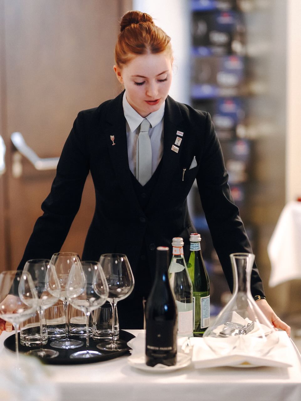 Als erste Aufgabe galt es einen umfassenden Fragebogen auszufüllen, der etwa die klassifizierten Rebsorten österreichischer DAC-Gebiete, das Benennen von Flaschengrößen, das Verorten von namhaften Rieden inklusive Winzer*in, Kellertechnik und allgemeine Getränkekunde umfasste. Beim praktischen Teil war eine Flasche Rotwein zu servieren und auf den kniffligen Änderungswunsch eines Gastes einzugehen.
