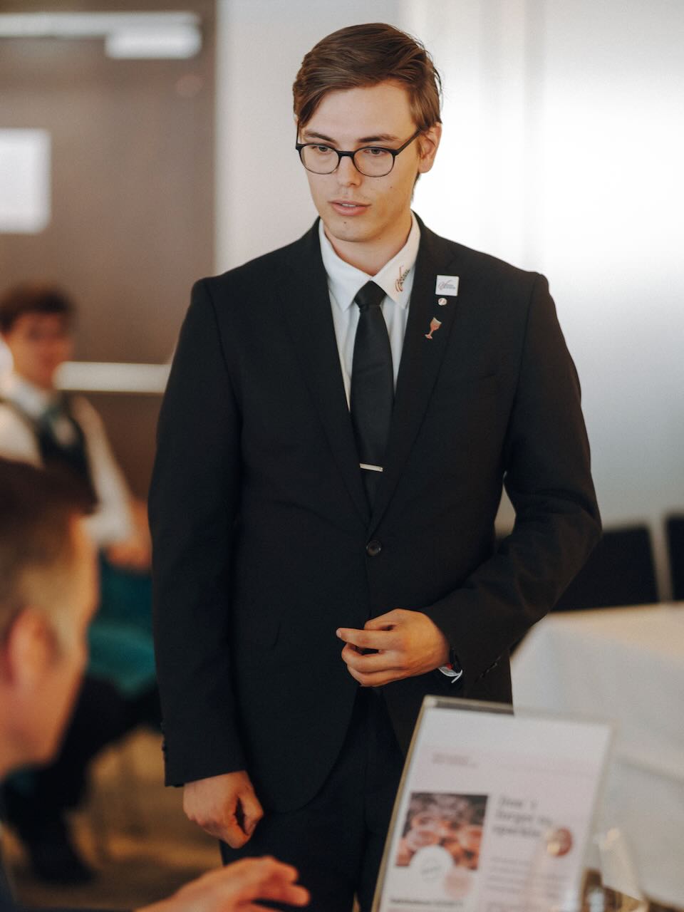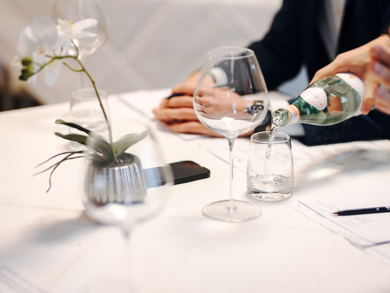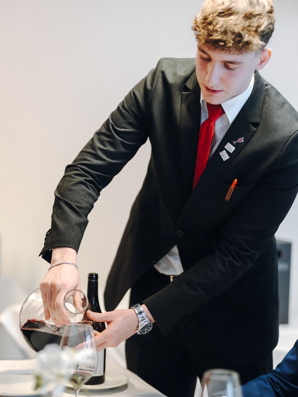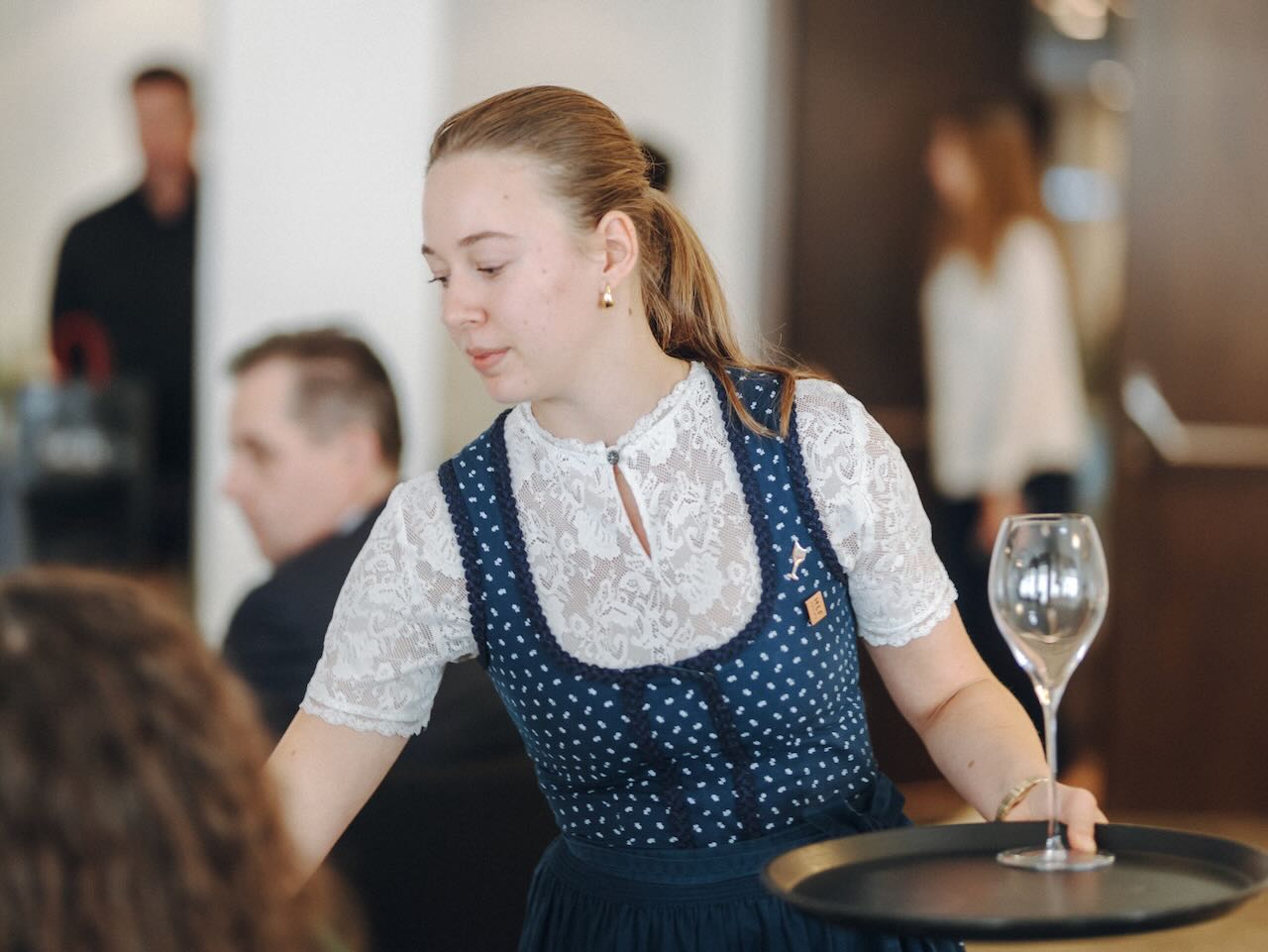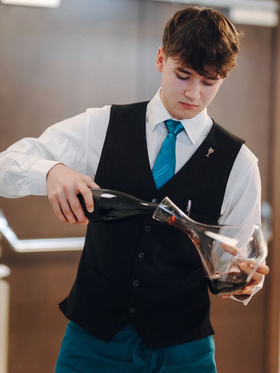 Als erste Aufgabe galt es einen umfassenden Fragebogen auszufüllen, der etwa die klassifizierten Rebsorten österreichischer DAC-Gebiete, das Benennen von Flaschengrößen, das Verorten von namhaften Rieden inklusive Winzer*in, Kellertechnik und allgemeine Getränkekunde umfasste. Beim praktischen Teil war eine Flasche Rotwein zu servieren und auf den kniffligen Änderungswunsch eines Gastes einzugehen.